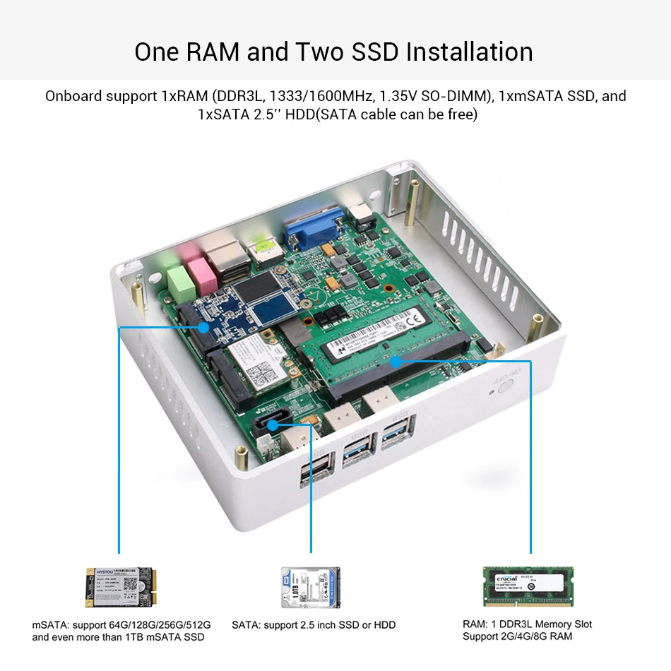 Intel Core i3 7100U ( 2 core 4 threads, 2.40GHz, TDP: 15W, Intel HD Graphics 620 )Intel Core i5 7200U ( 2 core 4 threads, 2.50GHz, TDP: 15W, Intel HD Graphics 620 )Intel Core i7 5500U ( 2 core 4 threads, 2.40GHz, TDP: 15W, Intel HD Graphics 5500 )Intel Core i7 4500U ( 2 core 4 threads, 1.80GHz, TDP: 15W, Intel HD Graphics 4400 )Intel Core i5 4200Y ( 2 core 4 threads, 1.50GHz, TDP: 11.5W, Intel HD Graphics 4200 )Operating System: Windows 10/8 /7 Linux Ubuntu etc. (7th Gen can't support windows 7)RAM type: 1xDDR3L 1333/1600MHz 1.35V mSATAWireless wifi: With dual antenna, 802.11.b/g/nCooling type: Fanless with aluminium heatsinkDimension: 174×127×37mmColor: Black & silverInterface: 1 * HD + 1 * VGA4 * USB 3.0 + 2 * USB 2.01* 1000Mbps LAN + *MIC/SPKDC 100-240V AC/50-24HzDC 12V/5APackage lists: