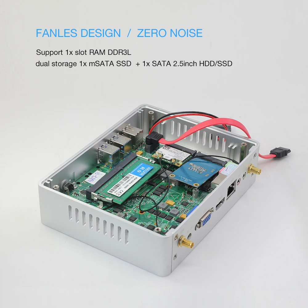 XCY Fanless Mini PC Intel Celeron J1900 Quad Cores Windows 10 Linux DDR3L RAM mSATA SSD Dual Ethernet RS232 HDMI VGA 4xUSB WiFi
