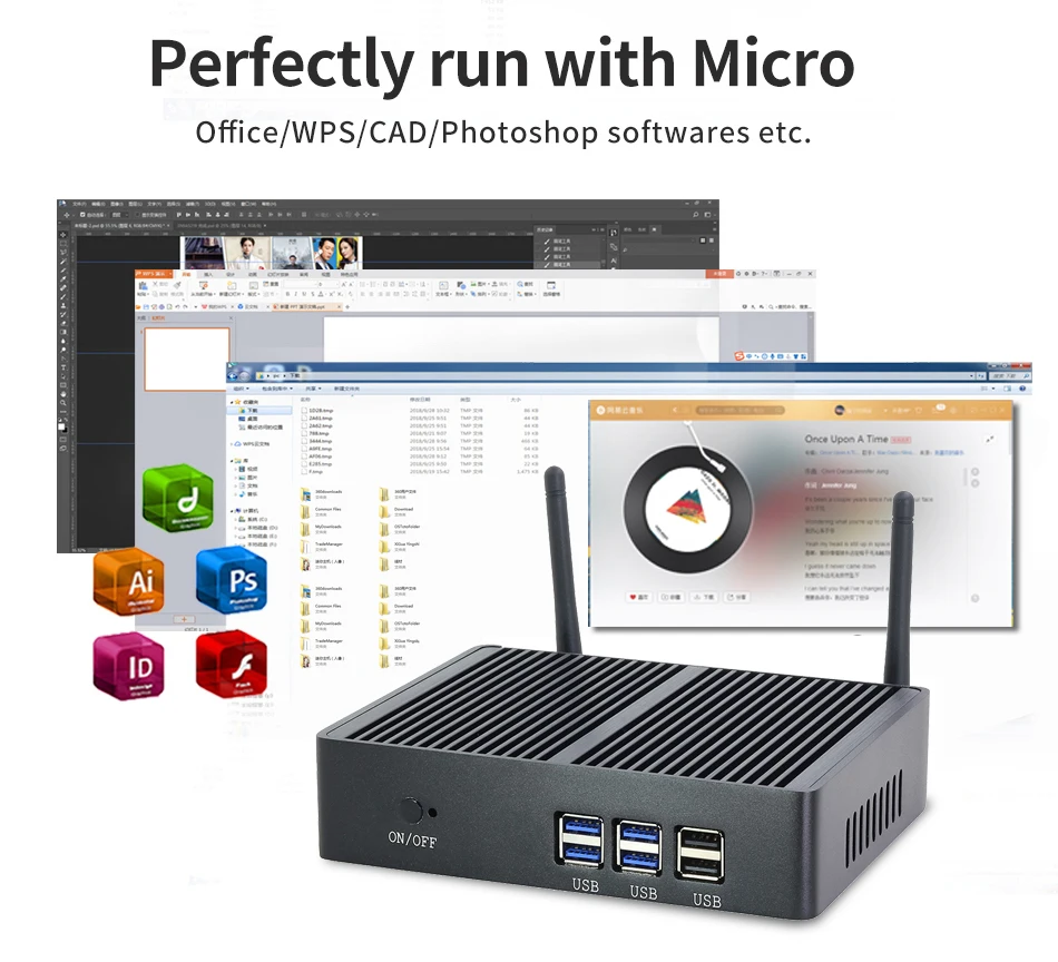 1x Mini PC1x power adapter1x WIFI moduel and two antennas 1x User Manual