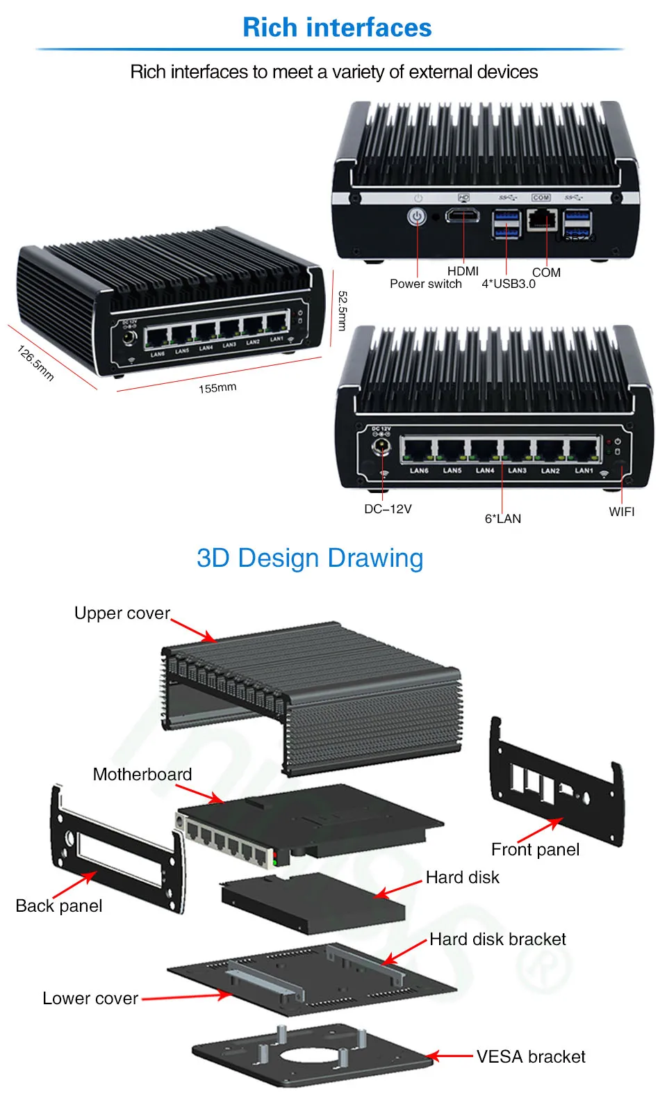 Xcy Fanless Mini Pc Intel Core i5 8265U Celeron 6 LAN 211at Gigabit Ethernet 2*Usb 3.0 HDMI RS232 Firewall Router PFsense Minipc
