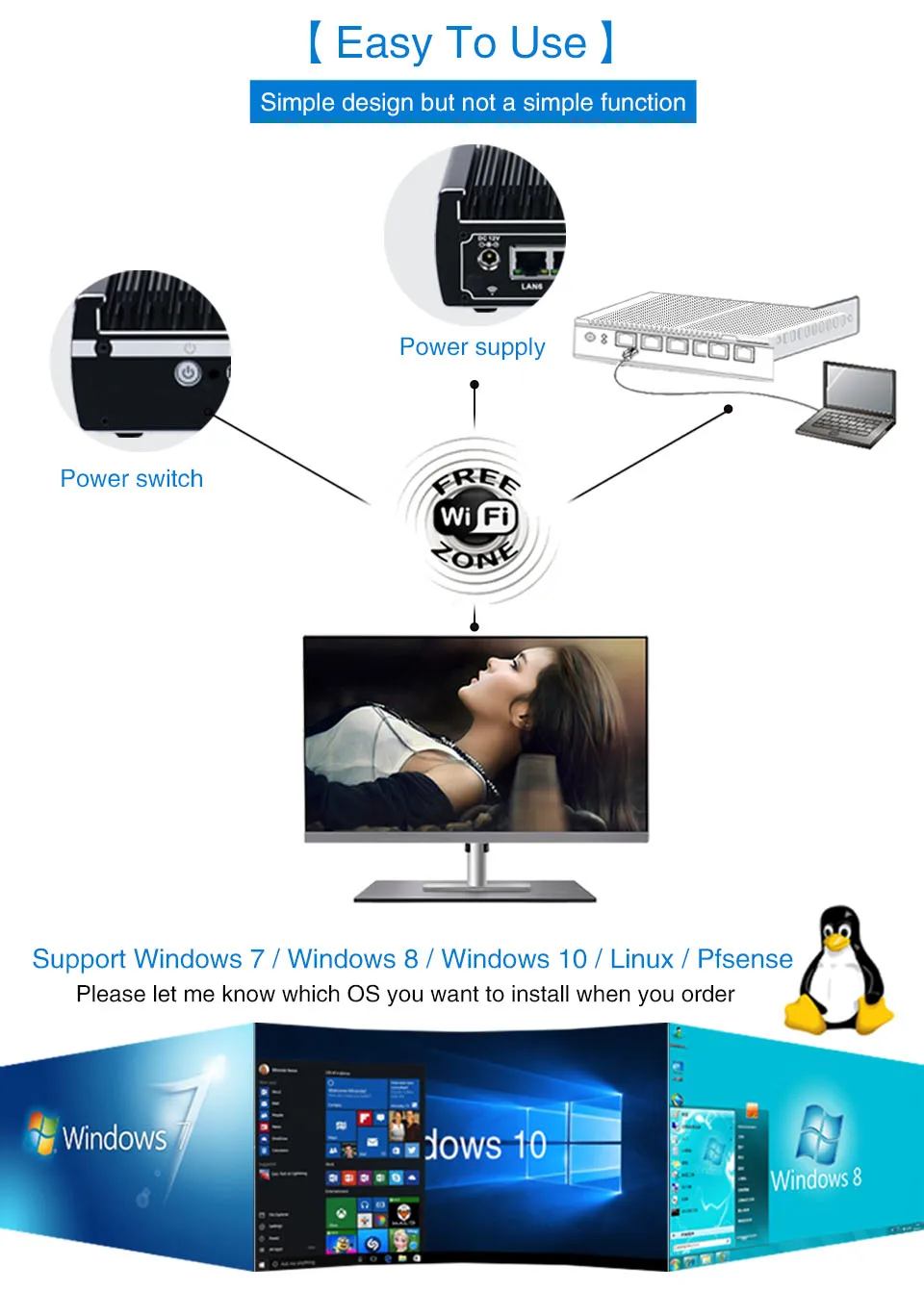 XCY Fanless Mini Pc Intel Celeron j1900 Win Windows 10 7 Linux Thin Client Minipc Pfsense Micro 2 Lan Port Tv Desktop Computers