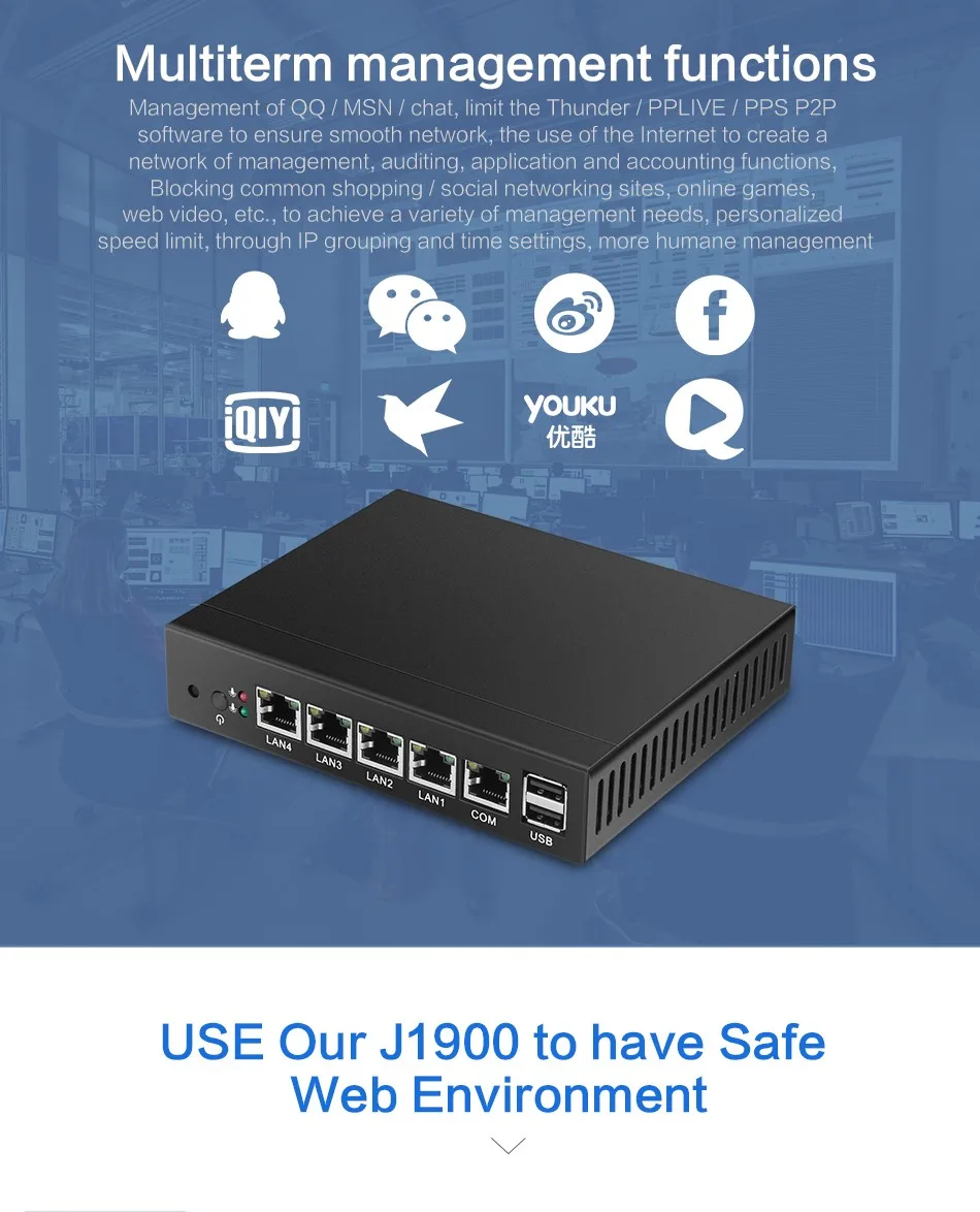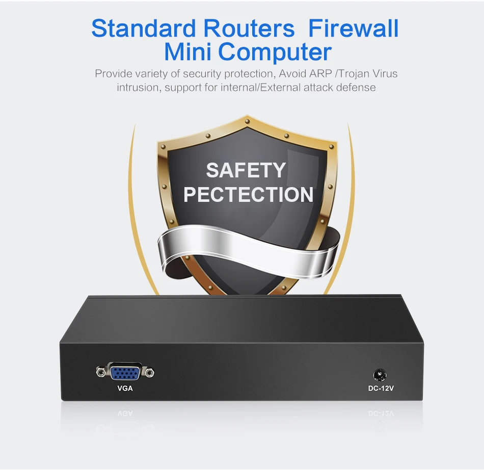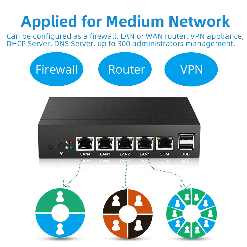 ① Support one DDR3L 1.35V memory, max to 8GB & one mSATA SSD hard drive;② Intel i211AT 1000Mbps LAN③ Fanless construction, offering you zero noise experience;④ Connectivity with 1x COM RJ45 console, 4x LAN, 2x USB 2.0, 1x VGA⑤ Enterprise firewall appliance, support virtualization, wake-up on LAN, automatically power on after power restore.⑥ Can be configured as a firewall, LAN or WAN router, VPN appliance, DHCP Server, DNS Server.Common Use Case:SMB to Medium Sized NetworksSmall to Medium Sized Branch OfficeManaged Service Providers (MSP) / Managed Security Service Provider (MSSP) On-Premises ApplianceHome or Commercial High-Speed Gigabit ConnectionsMultiple VPN ConnectionsProcessors Performance