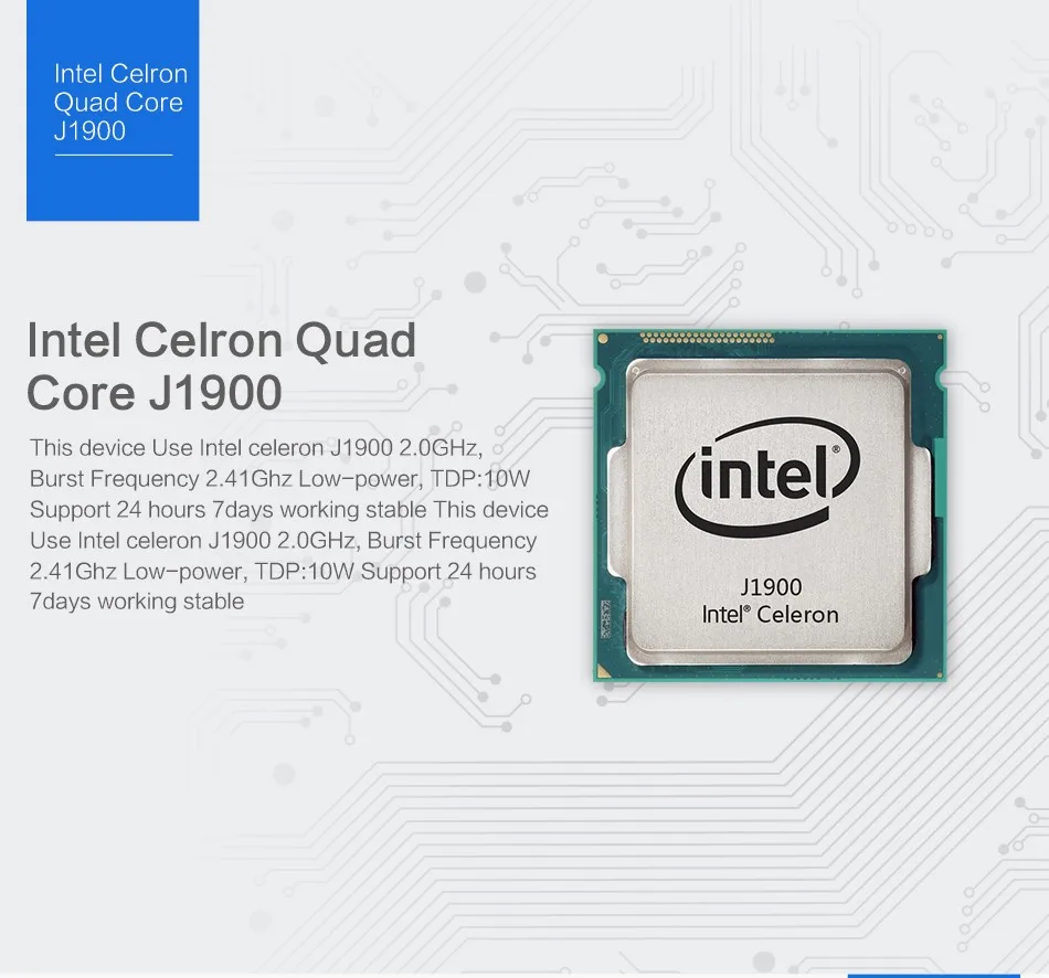 Intel Celeron J1900 ( Quad-core, 2.00GHz, up to 2.42GHz )Intel Celeron J1800 ( dual-core, 2.41GHz, up to 2.58GHz )Package Includes